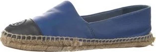 Tory Burch Leather Espadrilles Blue Colorblock Pattern Round-Toes Designer Fit: This designer typically runs true to size. Unfortunately, due to restrictions, this item may not be eligible for shipping in all areas.
