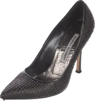 Manolo Blahnik Leather Pumps Black Pointed-Toes with Studded Accents Fit: This style typically runs narrow and a half size small. Unfortunately, due to restrictions, this item may not be eligible for shipping in all areas.