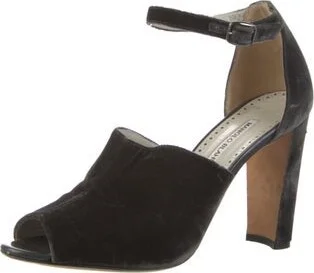 Manolo Blahnik Velvet D'Orsay Pumps Black Leather Trim Peep-Toes Wrap-Around Straps & Buckle Closure at Ankles Fit: This style typically runs narrow and a half size small. Read more