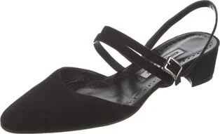 Manolo Blahnik Suede Black Leather Trim Semi-Pointed Toes Buckle Closure at Ankles Fit: This style typically runs narrow and a half size small. Read more