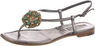 Manolo Blahnik Leather T-Strap Sandals Brown & Metallic Straps & Buckle Closure at Sides Fit: This style typically runs narrow and a half size small. Unfortunately, due to restrictions, this item may Read more