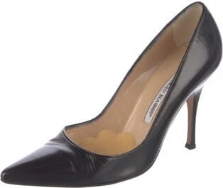 Manolo Blahnik Leather Pumps Black Semi-Pointed Toes Fit: This style typically runs narrow and a half size small. Unfortunately, due to restrictions, this item may not be eligible for shipping in all areas.