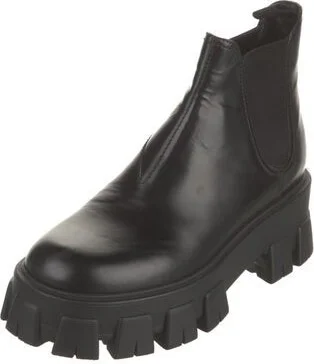 Prada Leather Ankle Chelsea Boots Black Round-Toes Platform Includes Box & Dust Bag Fit: This style typically runs a half size small. Unfortunately, due to restrictions, this item may not be eligible for shipping in all areas.
