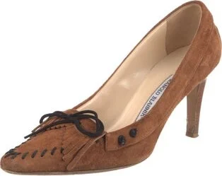 Manolo Blahnik Suede Pumps Brown Fringe & Bow Accents Semi-Pointed Toes Fit: This style typically runs narrow and a half size small. Read more