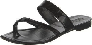 Manolo Blahnik Leather Slides Blue Straps Fit: This style typically runs narrow and a half size small. Unfortunately, due to restrictions, this item may not be eligible for shipping in all areas.