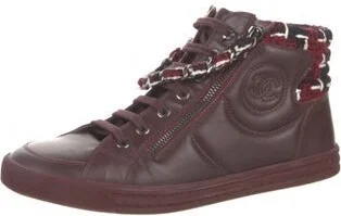 Chanel Lambskin High Top Sneakers From the 2015 Collection by Karl Lagerfeld Burgundy Interlocking CC Logo, Chain-Link Accent & Tweed Pattern Round-Toes with Chain-Link Accents Lace-Up Closure at Uppe Read more