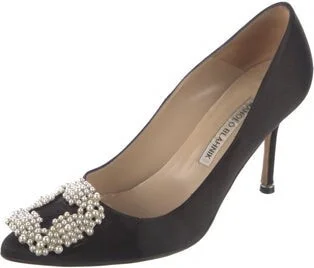 Manolo Blahnik Satin Pumps Black Semi-Pointed Toes with Crystal Embellishments Fit: This style typically runs narrow and a half size small.