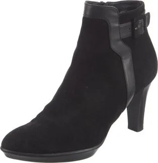 Aquatalia Suede Ankle Boots Black Leather Trim Semi-Pointed Toes with Leather Trim Embellishment Wrap-Around Straps & Exposed Zip Closure at Sides Fit: Boots by Aquatalia typically run small, consider Read more