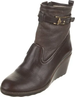 Tory Burch Leather Ankle Boots Brown Round-Toes Wrap-Around Straps & Exposed Zip Closure at Sides Size not listed, estimated from measurements. Designer Fit: This designer typically runs true to size. Unfortunately, due to restrictions, this item may not be eligible for shipping in all areas.