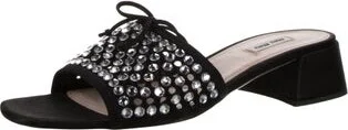 Miu Miu Leather Slides Black Crystal, Bow & Lasercut Accents Unfortunately, due to restrictions, this item may not be eligible for shipping in all areas.