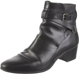 Saint Laurent Leather Ankle Boots Black Semi-Pointed Toes Wrap-Around Straps & Buckle Closure at Sides Fit: This style typically runs a half size small. Unfortunately, due to restrictions, this item may not be eligible for shipping in all areas.
