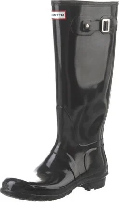 Hunter Rubber Knee-High Rain Boots Black Round-Toes Buckle Closure at Sides Read more