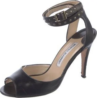 Manolo Blahnik Leather Sandals Black Studded Accents Wrap-Around Straps & Buckle Closure at Ankles Includes Box & Dust Bag Fit: This style typically runs narrow and a half size small. Unfortunately, due to restrictions, this item may not be eligible for shipping in all areas.