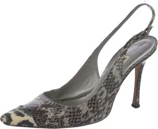 Manolo Blahnik Embossed Leather Slingback Pumps Neutrals Animal Print Semi-Pointed Toes Buckle Closure at Ankles Includes Box Fit: This style typically runs narrow and a half size small.