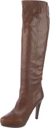 Prada Leather Knee-High Boots Brown Semi-Pointed Toes Platform Concealed Zip Closure at Sides Fit: This style typically runs a half size small. Unfortunately, due to restrictions, this item may not be eligible for shipping in all areas.