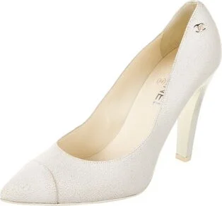 Chanel Leather Pumps White Interlocking CC Logo Semi-Pointed Toes Designer Fit: This style typically runs narrow and a half size small. Unfortunately, due to restrictions, this item may not be eligibl Read more