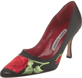 Manolo Blahnik Satin D'Orsay Pumps Black Floral Print Semi-Pointed Toes with Embroidered Accent Fit: This style typically runs narrow and a half size small. Read more