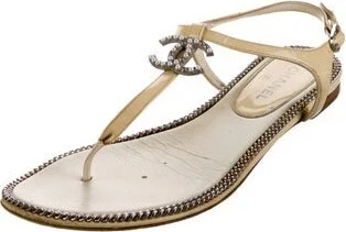 Chanel Patent Leather T-Strap Sandals By Karl Lagerfeld Neutrals Interlocking CC Logo, Faux Pearl Accents & Chain-Link Accent Chain-Link Accents Straps Designer Fit: This style typically runs narrow and a half size to a full size small.