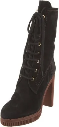 Tod's Suede Mid-Calf Lace-Up Boots Black Semi-Pointed Toes Platform Lace-Up Closure at Uppers & Exposed Zip Closure at Sides Includes Box