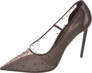 Saint Laurent Mesh T-Strap Pumps Brown Leather Trim Pointed-Toes with Crystal Embellishments Includes Box & Dust Bag Designer Fit: Pumps by Saint Laurent typically run a half size small.