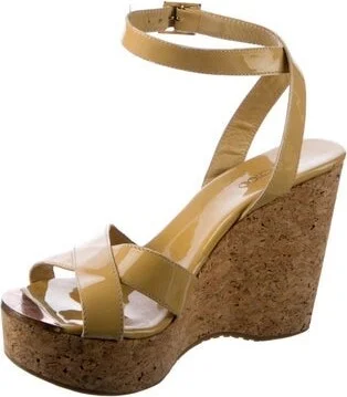 Jimmy Choo Patent Leather Sandals Neutrals Platform Crossover Straps & Buckle Closure at Ankles Fit: This style typically runs a full size small.