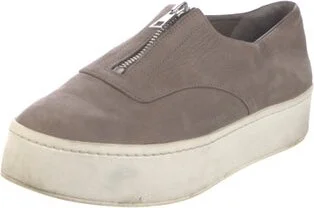 Vince Leather Slip-On Sneakers Grey Round-Toes with Whipstitch Trim Platform Exposed Zip Closure at Uppers Size not listed, estimated from measurements. Unfortunately, due to restrictions, this item may not be eligible for shipping in all areas.