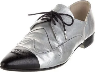 Chanel Leather Oxfords From the 2015 Collection by Karl Lagerfeld Silver Interlocking CC Logo Semi-Pointed Toes Mary Jane Strap & Tie Closures Designer Fit: This style typically runs narrow and a half Read more
