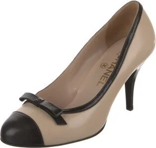 Chanel Lambskin Pumps By Karl Lagerfeld Neutrals Interlocking CC Logo Round-Toes with Bow Accents Designer Fit: This style typically runs narrow and a half size small. Read more