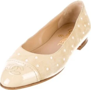 Chanel Suede Flats From the 2018 Collection by Karl Lagerfeld Neutrals Interlocking CC Logo & Faux Pearl Accents Round-Toes Designer Fit: This style typically runs narrow and a half size to a full siz Read more