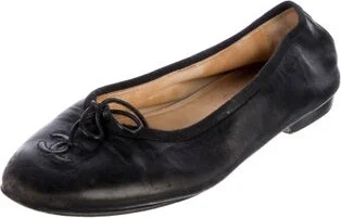 Chanel Lambskin Ballet Flats Black Interlocking CC Logo Semi-Pointed Toes with Bow Accents Designer Fit: This style typically runs narrow and a half size to a full size small. Read more