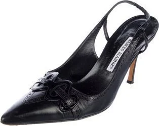 Manolo Blahnik Leather Slingback Pumps Black Pointed-Toes Straps Fit: This style typically runs narrow and a half size small. Unfortunately, due to restrictions, this item may not be eligible for shipping in all areas.