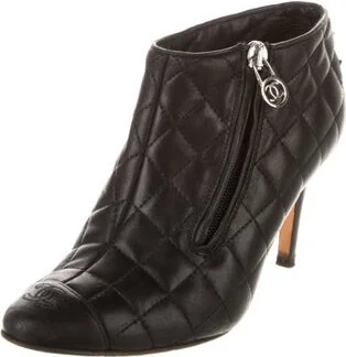 Chanel Vintage Ankle Boots Black Leather Interlocking CC Logo & Quilted Pattern Semi-Pointed Toes Concealed Zip Closure at Ankles Fit: This style typically runs a full size small. Unfortunately, due t Read more
