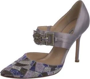 Manolo Blahnik Satin D'Orsay Pumps Purple Semi-Pointed Toes with Crystal Embellishments Multistrap Fit: This style typically runs narrow and a half size small. Read more