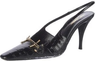 Saint Laurent Leather Slingback Pumps Black Horsebit Accent Square-Toes Straps Includes Box & Dust Bag Designer Fit: Pumps by Saint Laurent typically run a half size small. Unfortunately, due to restrictions, this item may not be eligible for shipping in all areas.