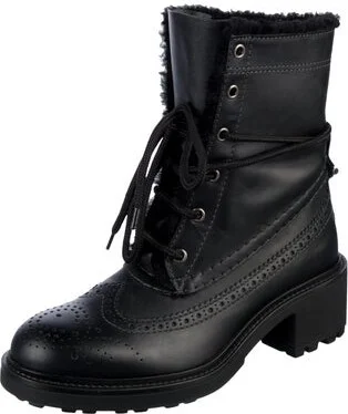 Chloé Leather Mid-Calf Combat Boots Black Fur & Lasercut Accents Round-Toes Wrap-Around Straps & Lace-Up Closure at Uppers Fit: This style typically runs a half size small. Unfortunately, due to rest Read more