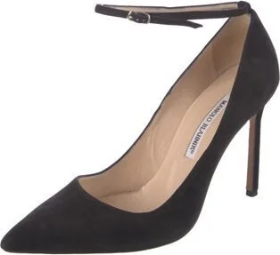Manolo Blahnik Suede Pumps Black Pointed-Toes Wrap-Around Straps & Buckle Closure at Ankles Fit: This style typically runs narrow and a half size small. Read more