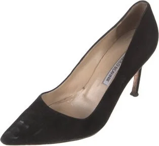 Manolo Blahnik Suede Pumps Black Semi-Pointed Toes Fit: This style typically runs narrow and a half size small. Read more