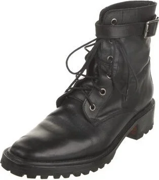 Rachel Comey Leather Ankle Combat Boots Black Square-Toes Wrap-Around Straps & Lace-Up Closure at Uppers Unfortunately, due to restrictions, this item may not be eligible for shipping in all areas. Read more