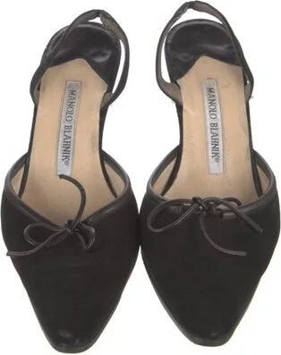 Manolo Blahnik Suede Slingback Pumps Black Pointed-Toes Straps Fit: This style typically runs narrow and a half size small.