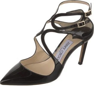 Jimmy Choo Patent Leather Pumps Black Pointed-Toes Crossover Straps & Buckle Closure at Ankles Fit: This style typically runs a half size small.