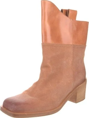 Chanel Suede Mid-Calf Boots Brown Interlocking CC Logo Leather Trim Square-Toes Includes Box & Dust Bag Fit: This style typically runs a full size small.
