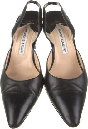 Manolo Blahnik Leather Slingback Pumps Black Square-Toes Size not listed, estimated from measurements. Fit: This style typically runs narrow and a half size small. Unfortunately, due to restrictions, this item may not be eligible for shipping in all areas.