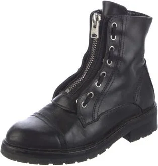 AllSaints Leather Ankle Combat Boots Black Round-Toes Exposed Zip Closure at Uppers Unfortunately, due to restrictions, this item may not be eligible for shipping in all areas.