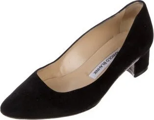 Manolo Blahnik Suede Pumps Black Semi-Pointed Toes Fit: This style typically runs narrow and a half size small. Read more