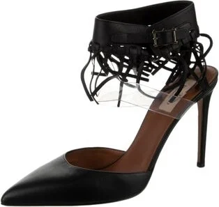 Valentino Leather D'Orsay Pumps Black Pointed-Toes with Fringe Trim Accent Wrap-Around Straps & Buckle Closure at Ankles Designer Fit: Pumps by Valentino typically run a half size small. Unfortunately, due to restrictions, this item may not be eligible for shipping in all areas.