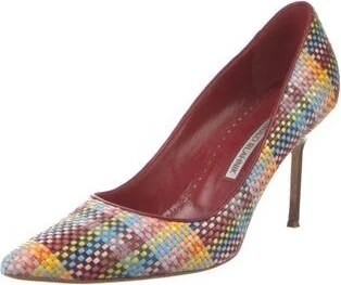 Manolo Blahnik Leather Pumps Blue Printed Semi-Pointed Toes Fit: This style typically runs narrow and a half size small. Unfortunately, due to restrictions, this item may not be eligible for shipping in all areas.