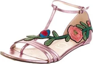 Gucci Leather T-Strap Sandals Pink Floral Print Straps & Buckle Closure at Ankles Unfortunately, due to restrictions, this item may not be eligible for shipping in all areas. Read more