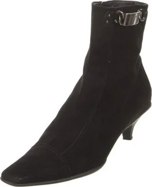 Prada Suede Ankle Sock Boots Black Square-Toes with Chain-Link Accents Exposed Zip Closure at Sides Fit: This style typically runs a half size small. Read more