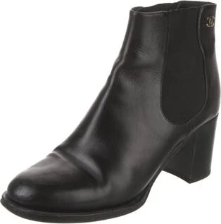 Chanel Leather Ankle Chelsea Boots By Karl Lagerfeld Black Interlocking CC Logo Round-Toes Includes Box & Dust Bag Fit: This style typically runs a full size small. Unfortunately, due to restrictions, Read more