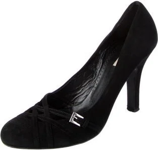Prada Suede Pumps Black Leather Trim Round-Toes Crossover Straps & Buckle Closure At Uppers Designer Fit: Pumps by Prada typically run a half size small.